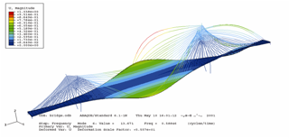 Abaqus提供了(le)兩種求解振型的(de)方法: Lanczos方法和≤∑(hé)Subspace兩種方法,兩種方法各有(yǒu)δφ∑優缺點,分(fēn)别實用(yòng)于規模較大(dà),頻(pín)率提取多(duō•♠♦)的(de)結構和(hé)規模小(xiǎo),頻(pín)率♥↓↑提取少(shǎo)的(de)結構。下(xià)圖橋梁長(cháng)140m,高(✔≥✔gāo)80m。其一(yī)階和(hé)四階振型如(rú)下(xià)圖所&©$示。