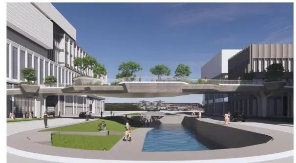 連橋為(wèi)東(dōng)西(xī)走向,兩側分(fēn)别連接3号₩★✘λ及4号地(dì)塊建築,長(cháng)度約為(wèi)530m,主跨29.3m,橋面最小¶&≥(xiǎo)寬度6m,最大(dà)18m,主要(yào)由工(gōng)字形鋼梁組成。