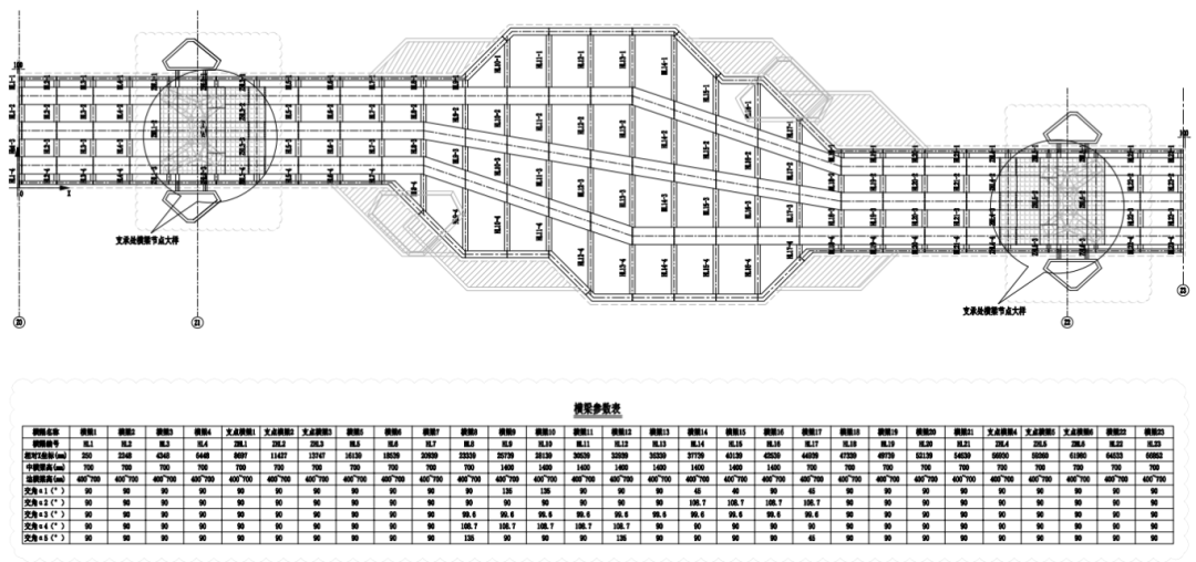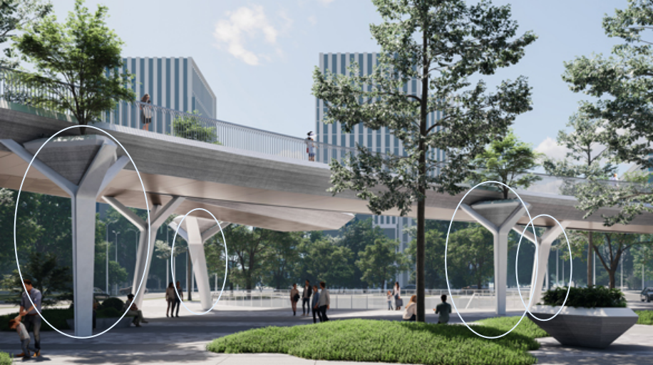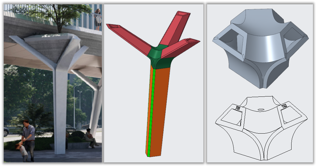 根據總體(tǐ)布置,PTI連橋下(xià)部設置有(yǒu)樹(shù)形柱(根據景觀需要(yà→'≈o)局部設置花(huā)缽柱)、Y型柱以及直柱。