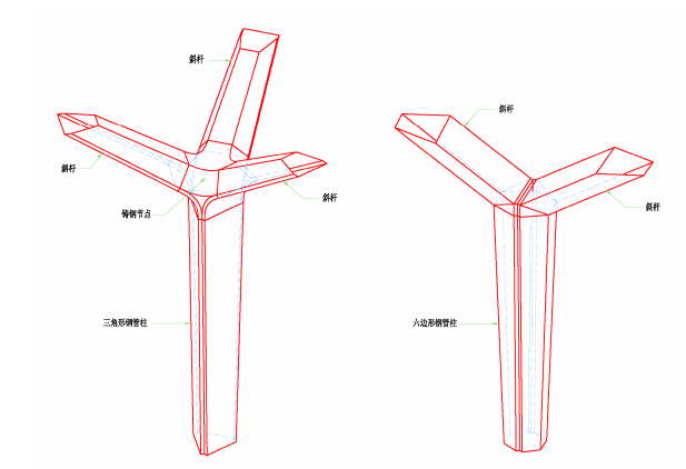 樹(shù)形柱鑄鋼件(jiàn)為(wèi)空(kōng)間(jiān)立體(tǐ)結構,且樹(shù)形柱斜杆外(wài)形相(xiàng)似但(dàn)各不(bù)相(xiàng)同。